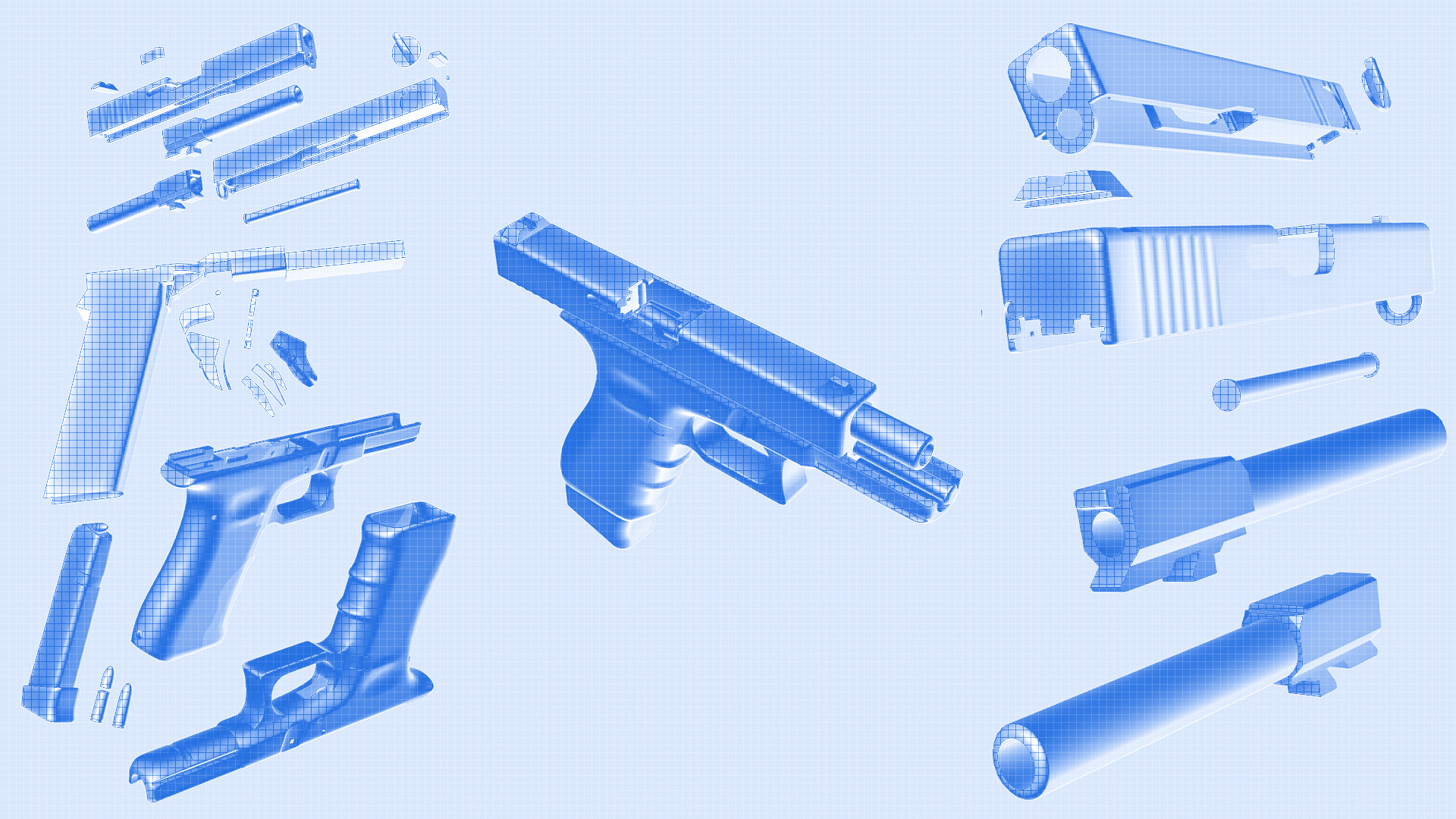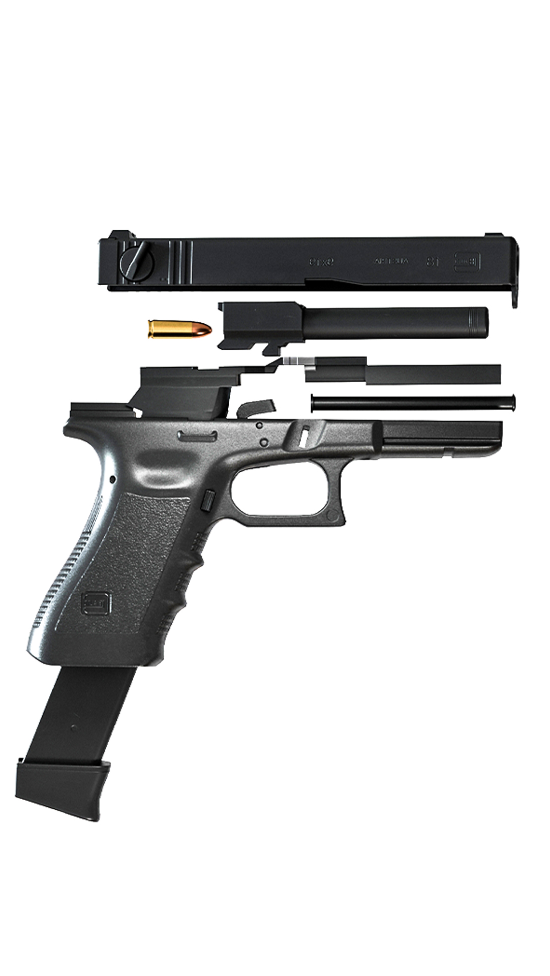 Die zentrale Animation demonstriert das Öffnen eines Waffenkoffers, das Zerlegen der Pistole, das Nachladen sowie den Schussvorgang – mit Fokus auf technische Präzision und realistische Bewegung.
