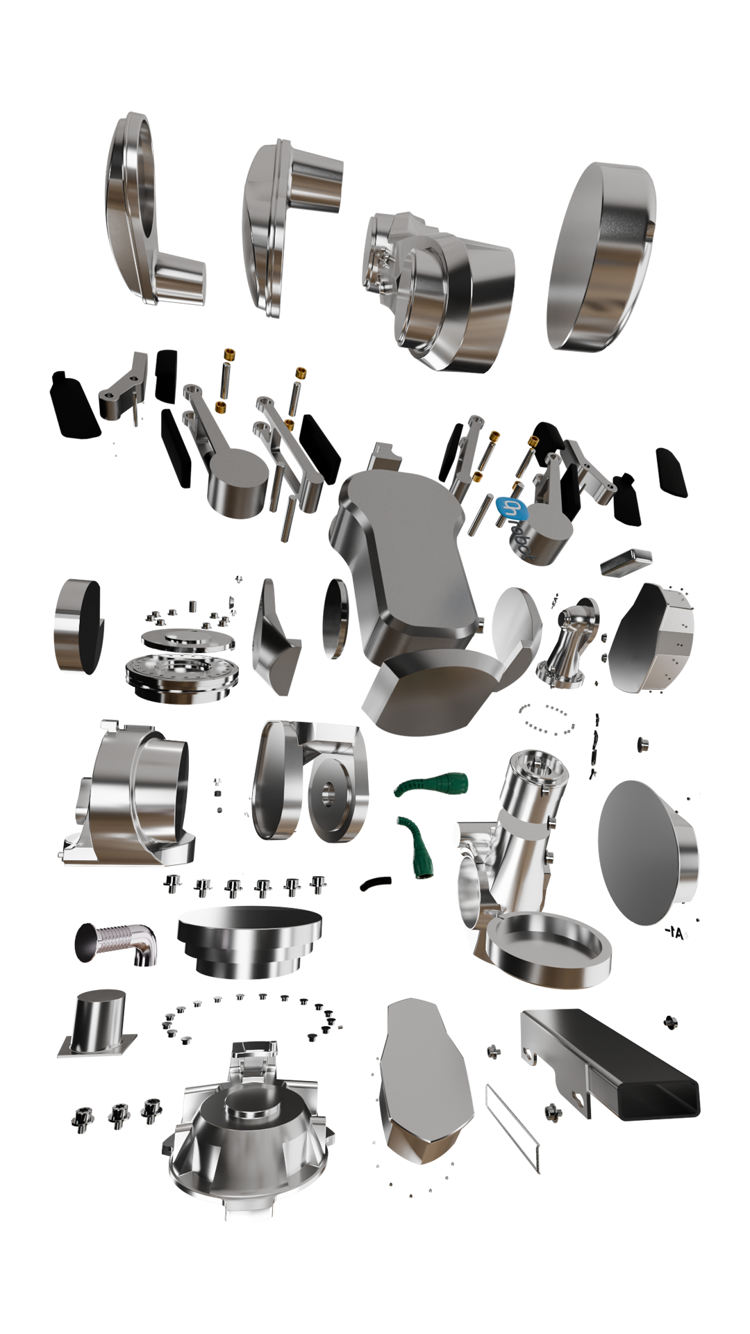 3D-Visualisierung von Aufbau, Mechanik und Einzelteilen im technischen Stil.